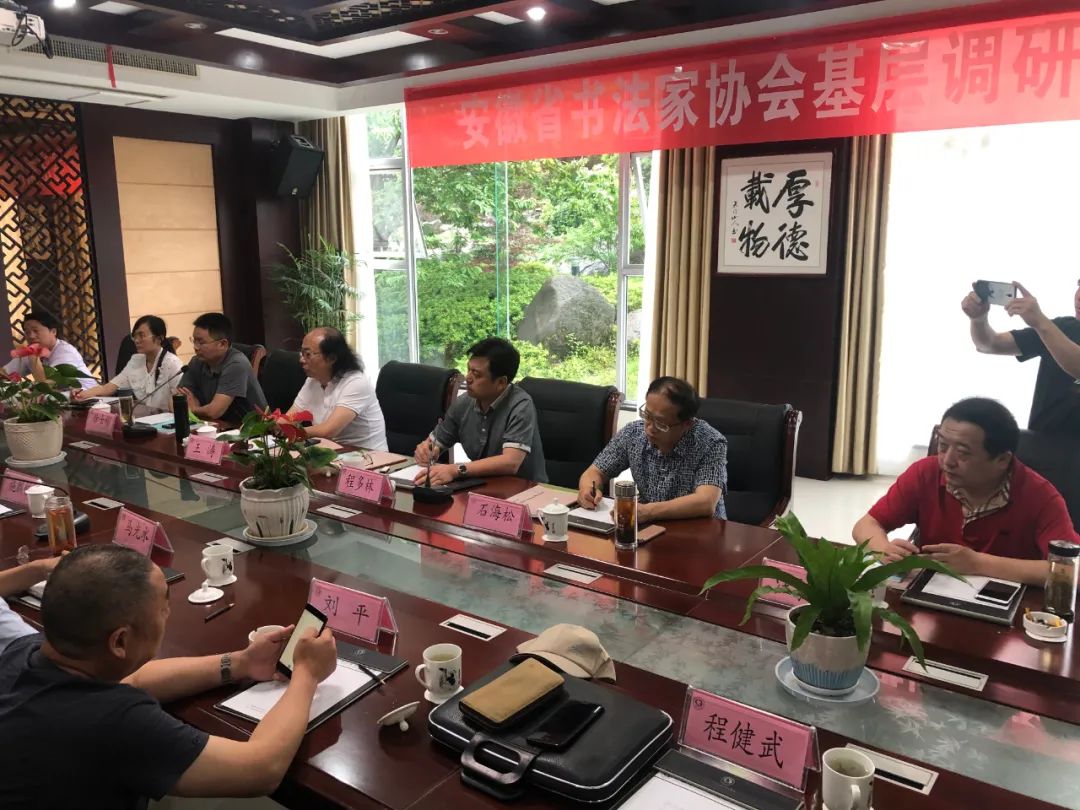 安徽省书法家协会 6月3日5月29日-31日,省书协副主席王涛、石海松,秘书长程多林,副秘书长(挂职)徐士彬,篆刻专业委员会副主任汪敏文一行赴青阳县、安庆市开展工作调研。5月29日下午,王涛一行与青阳县书法工作者进行了座谈,青阳县文联主席马... -